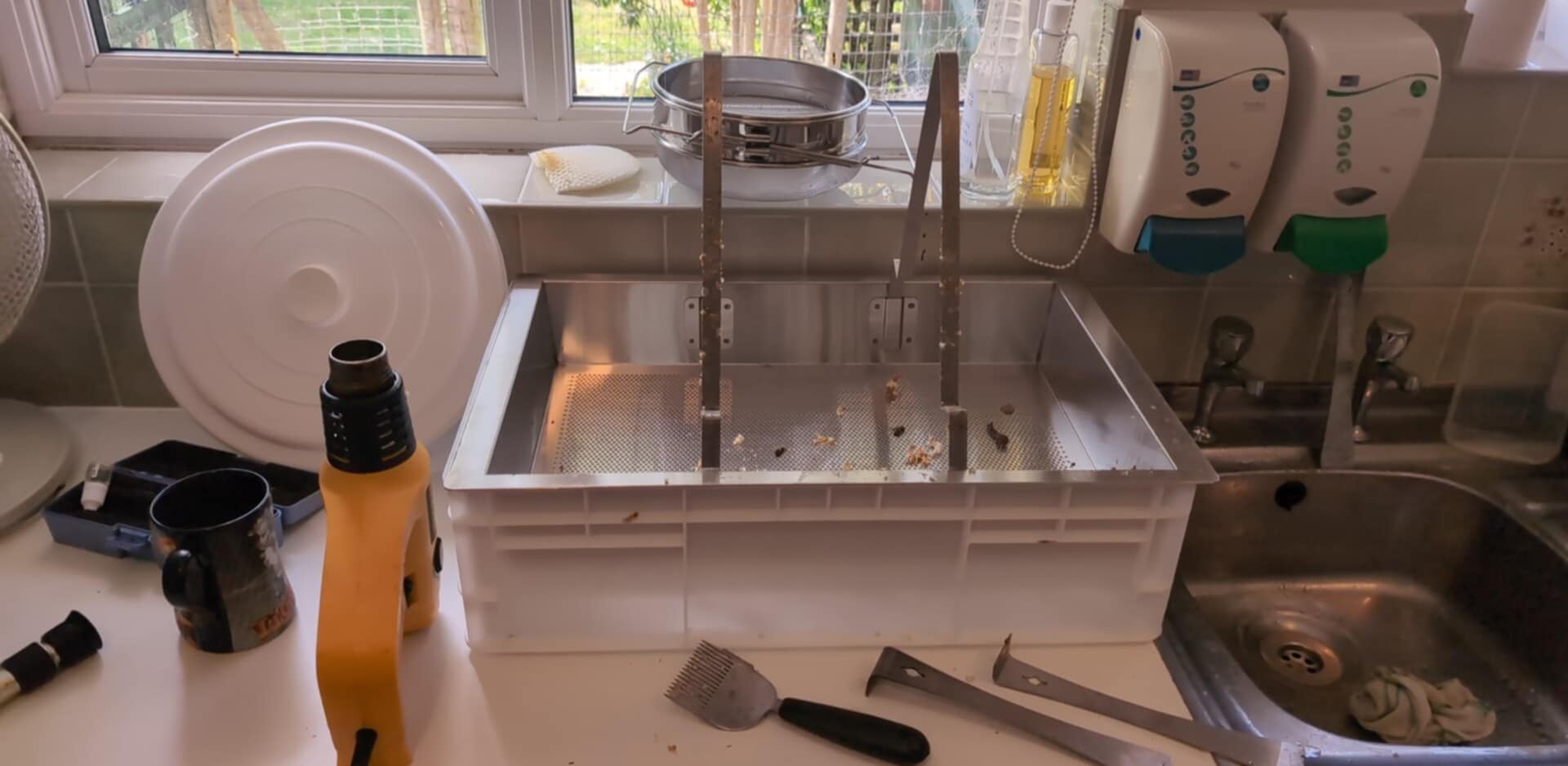 This harvest was my first time using the Logar uncapping stand and frame holder, and it worked well for me, although I gave up using the frame stand as I use mostly Manley super frames which do not fit. But it was great to have somewhere that could be used for items dripping in honey.